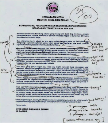 Kenyataan media bertajuk Berhubung isu pelepasan pemain skuad bola sepak Bawah 23 negara bagi temasya Sukan Asia 2018 yang di keluarkan pada Ahad oleh Syed Saddiq Syed Abdul Rahman itu menjadi bahan ejekan netizen di media sosial...